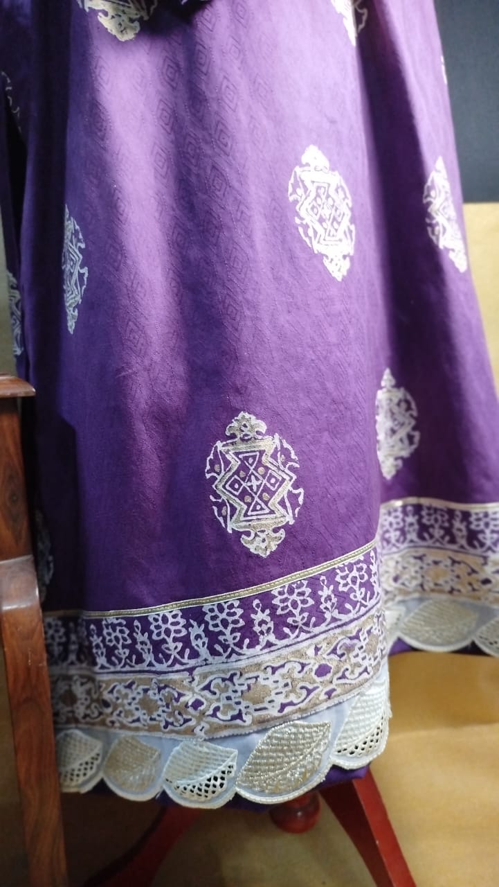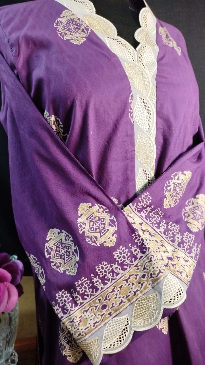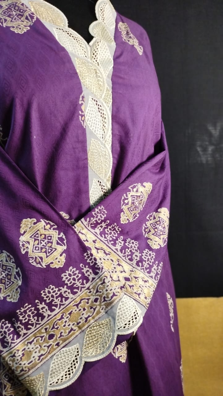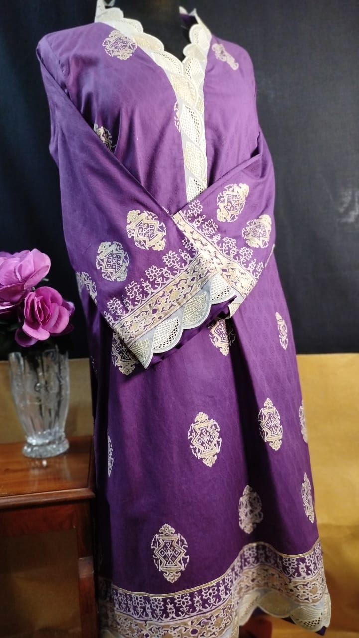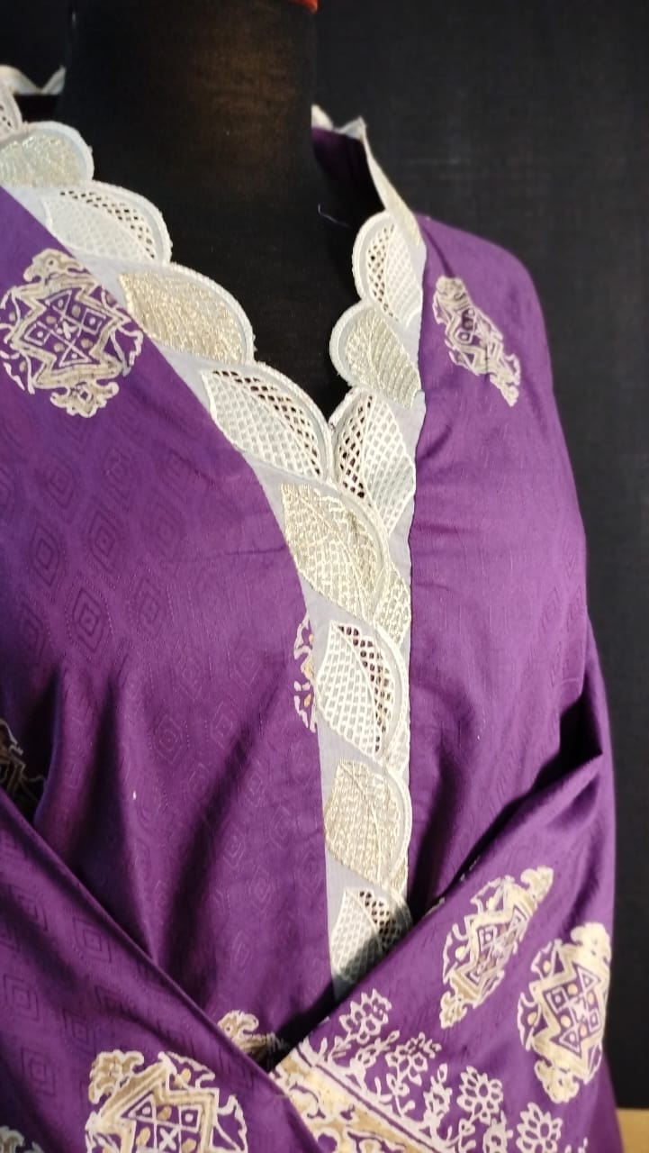 Expertly crafted and luxurious, our Royal Purple shirt features intricate block printing and lace detailing on jacquard lawn fabric. The regal purple color exudes elegance and sophistication, making it a must-have addition to your wardrobe. Elevate your style with this unique and beautiful piece.