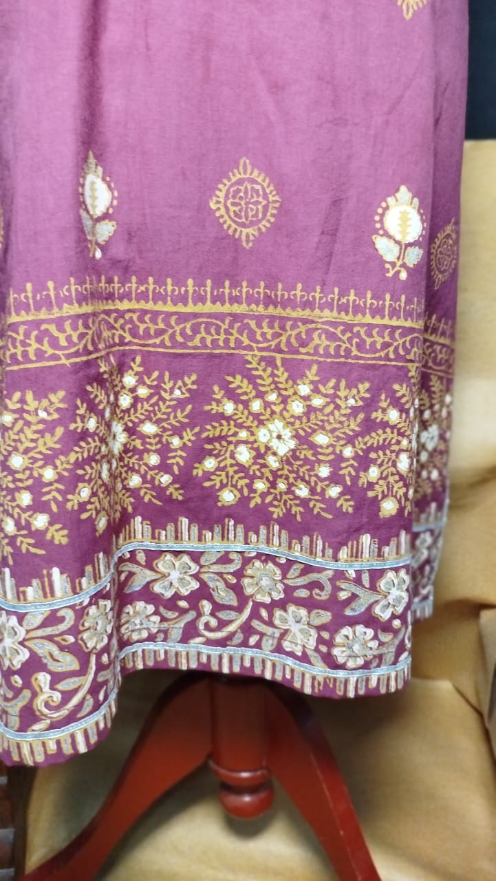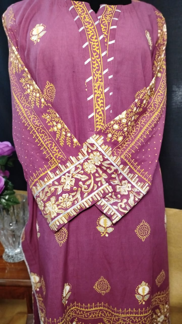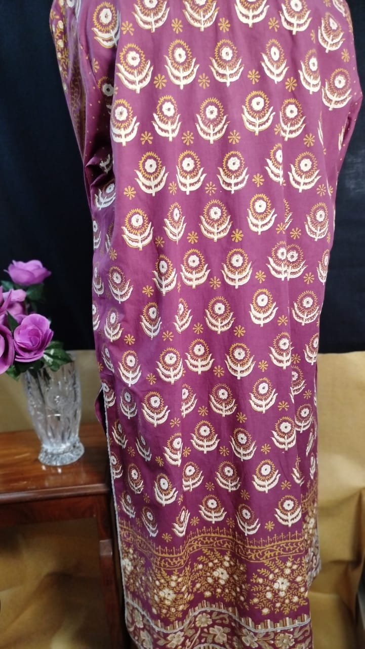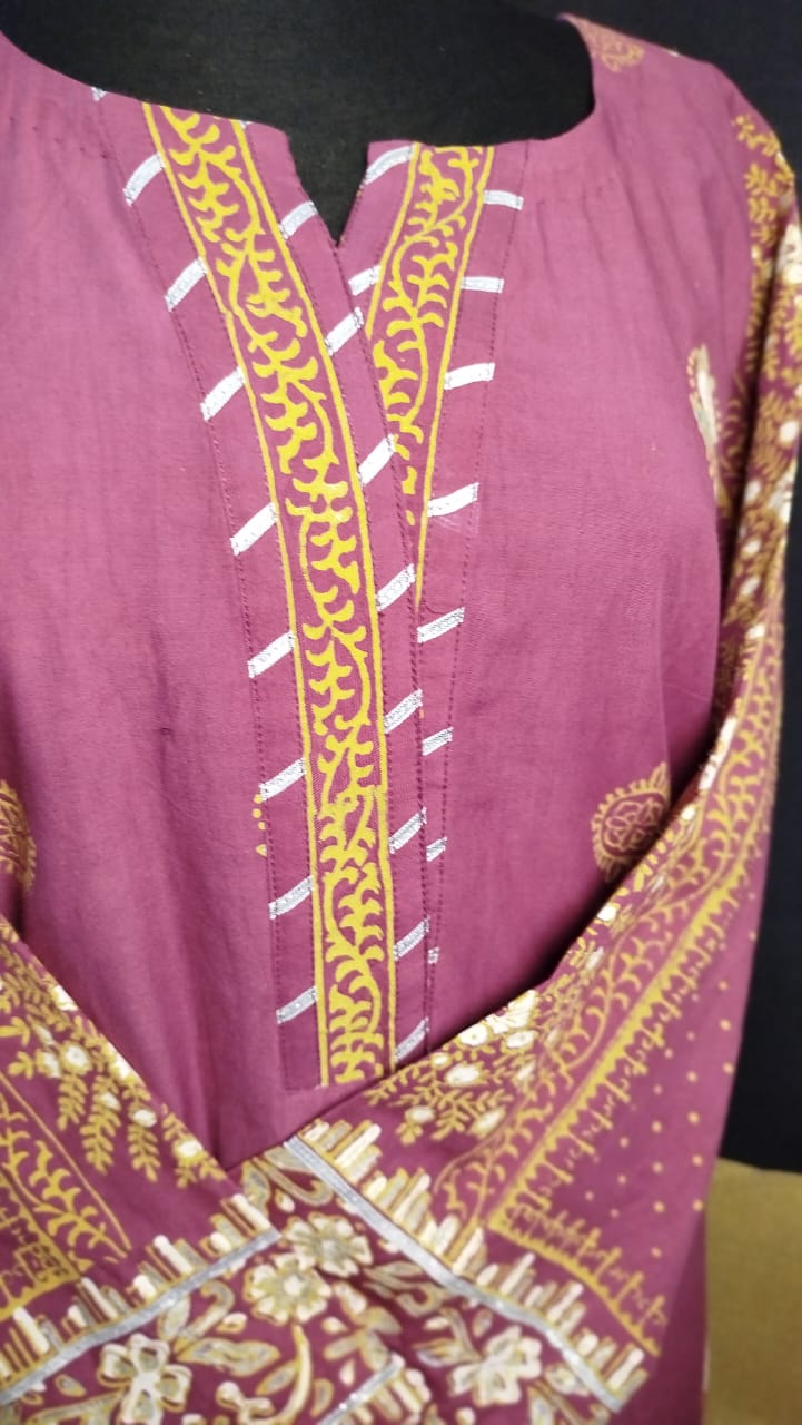 Elevate your wardrobe with this exquisite magenta-colored traditional dress, beautifully adorned with intricate golden and silver blocked patterns. The rich fabric features detailed floral and geometric patterns, giving it an elegant and regal appeal.
