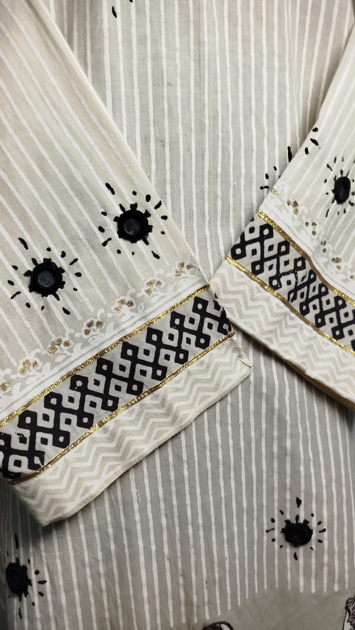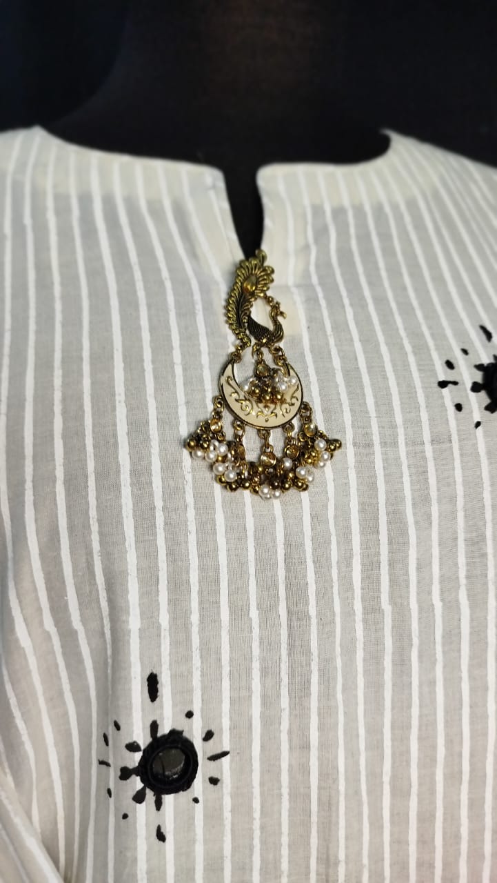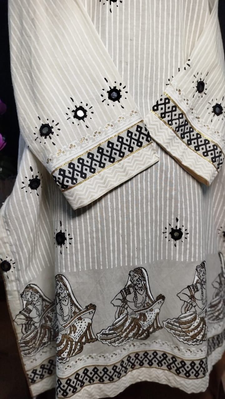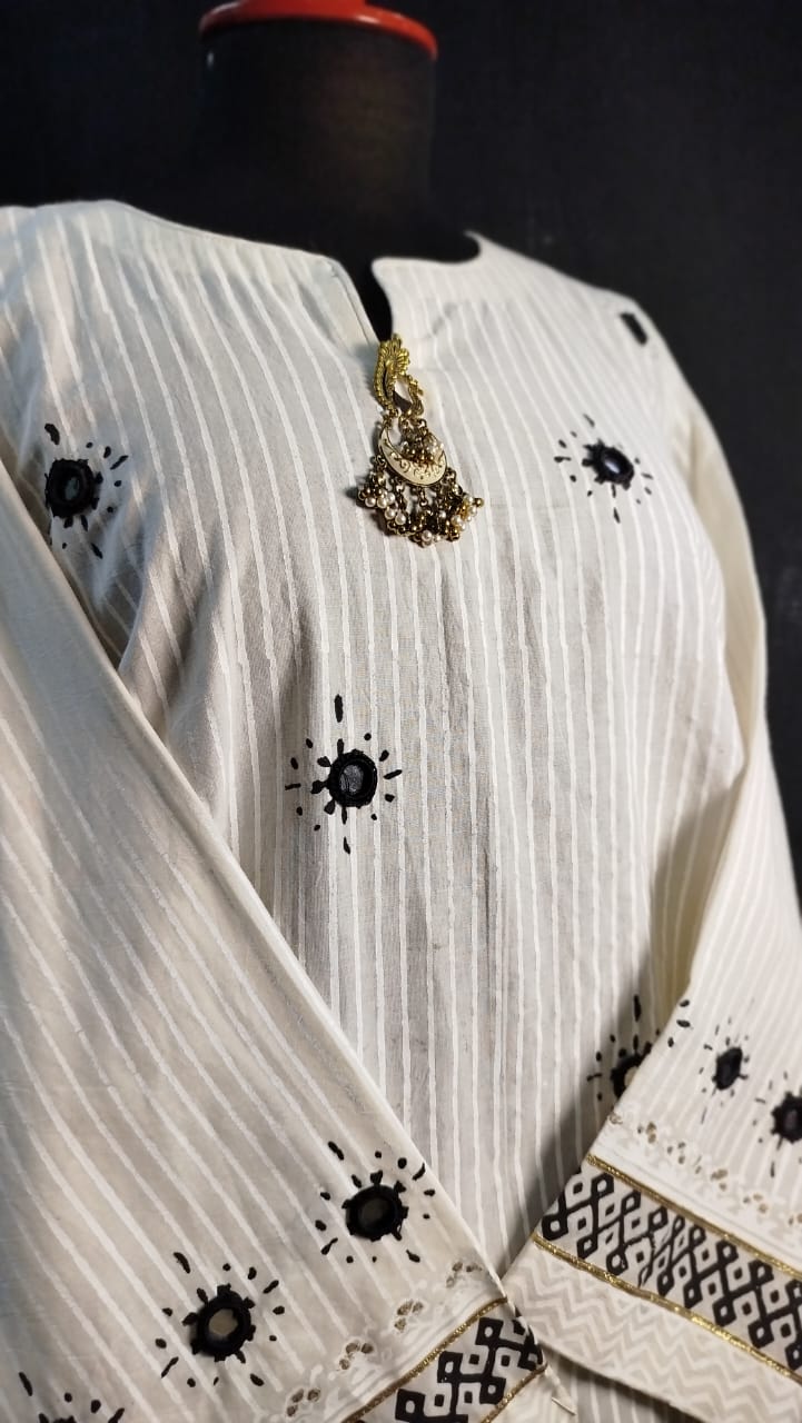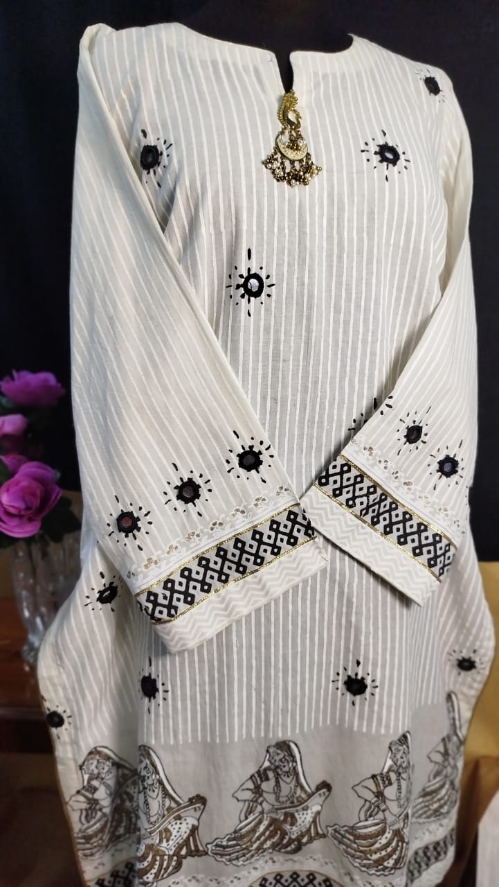 Make a statement with our pearl white kurta with vertical white stripes on the base and adorned with black geometric motifs scattered across the fabric. The hemline is decorated with a row of intricate illustrations depicting traditional dancers, adding a cultural and artistic touch. The border features a black geometric pattern. The neckline is simple with a notch design, accessorized with an elegant metallic pendant-like tassel. The fabric lightweight lawn and ideal for casual or semi-formal wear.