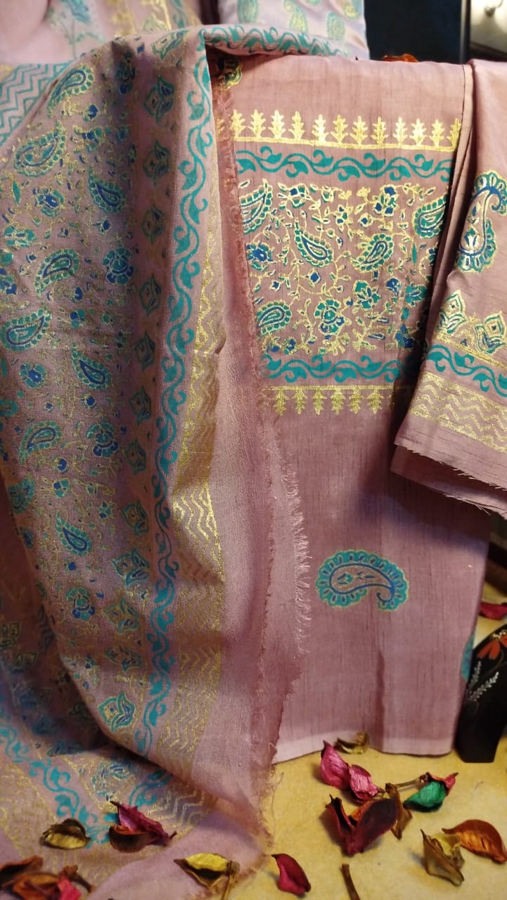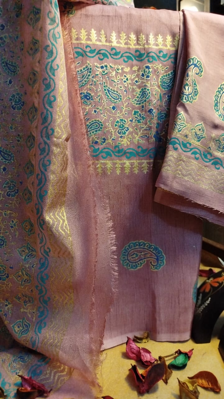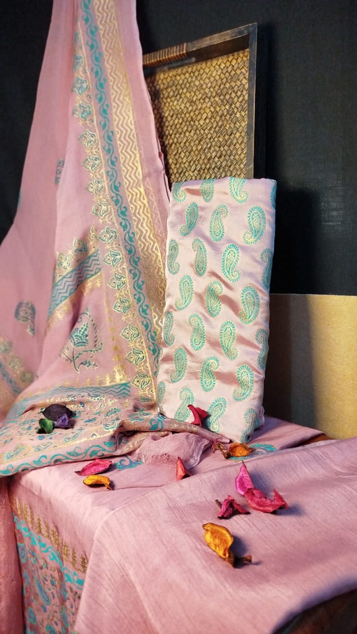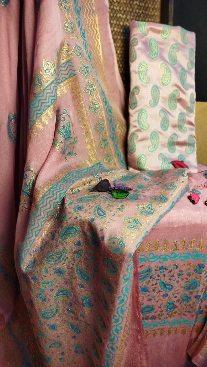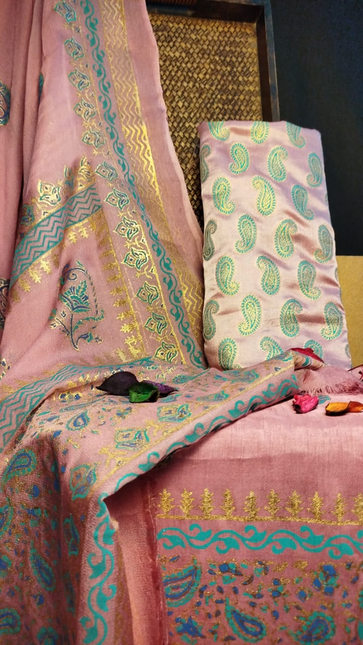 Drape yourself in elegance and tradition with this beautifully designed 3-piece outfit, featuring a soft pink Korean silk shirt, adorned with teal blue paisley and floral block prints. The ensemble is completed with an ethereal chiffon dupatta and luxurious banarsi fabric for trousers/shalwar, enhanced by elaborate borders for a regal finish.