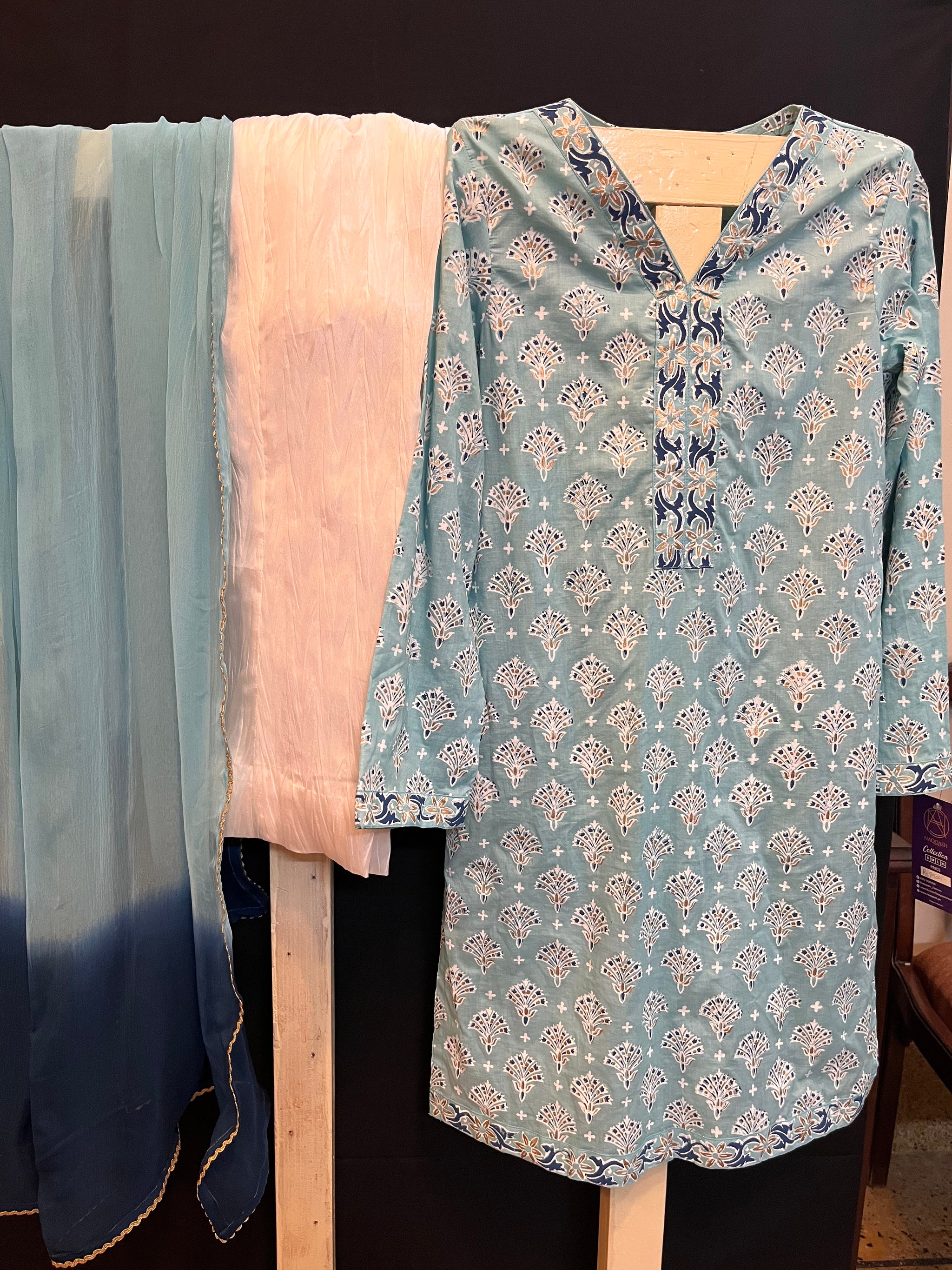 Hand blocked shirt with crushed silk white izaar and tie and dye chiffon dupatta