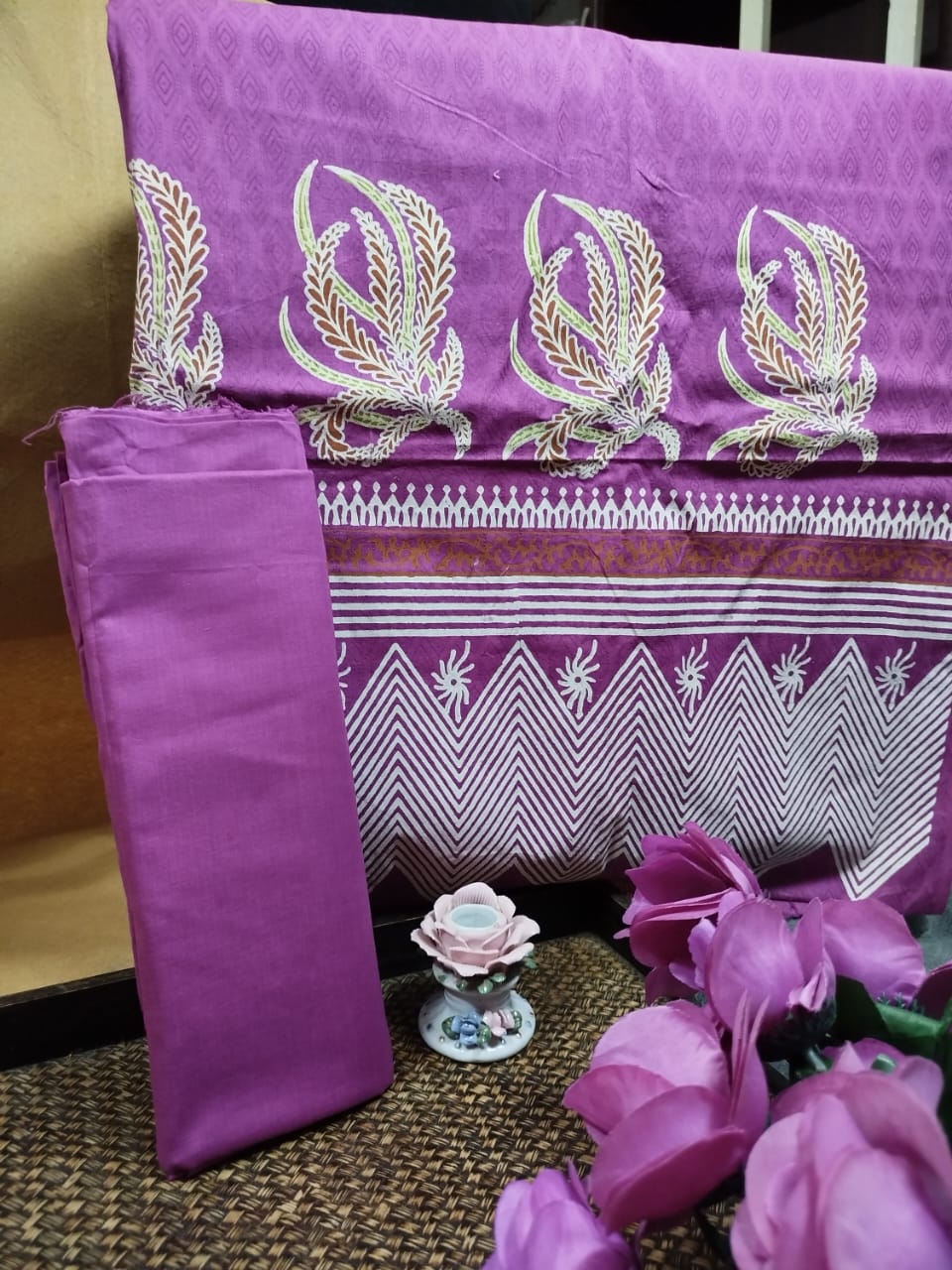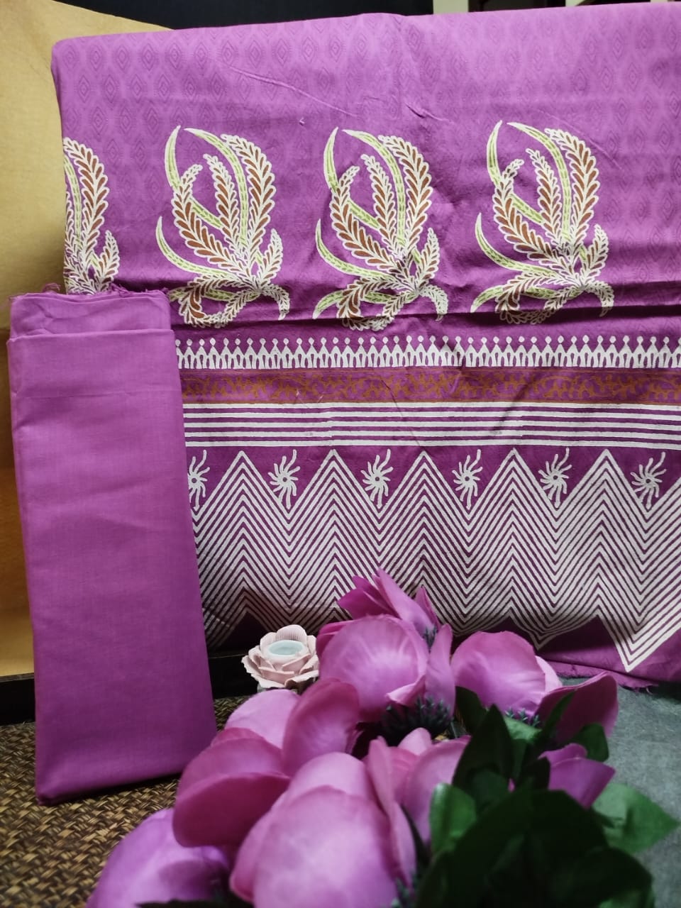 Expertly crafted with magenta jacquard lawn fabric, the Magenta two-piece set offers a stylish and versatile addition to any wardrobe. Unstitched for easy customization, the intricate white, green, and red block-printed motifs and borders add a touch of elegance to this cambric trouser material.