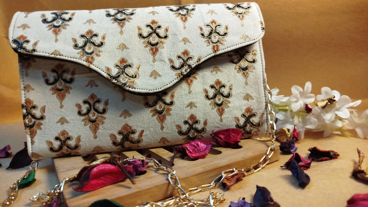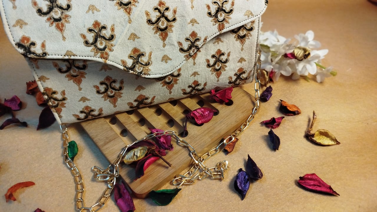 Stand out with this eye-catching sling bag, adorned with an intricate floral pattern in rust, green and gold. The handcrafted design gives it a unique touch, while the compact size makes it ideal for carrying essentials with style.