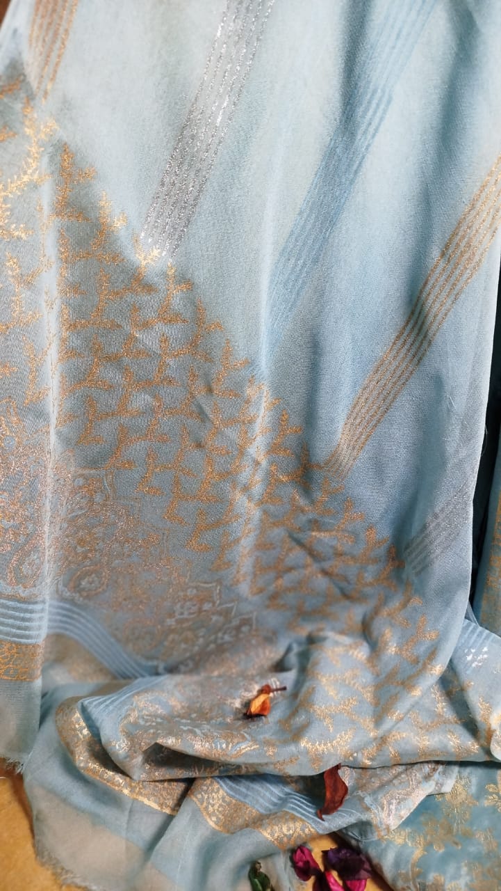 Enhance your wardrobe with this luxurious 3-piece unstitched suit, featuring a stunning ice blue and turquoise block-printed Korean silk shirt. Paired with a delicate chiffon dupatta and Banarsi shalwar material, this ensemble exudes timeless elegance and sophistication. Perfect for special occasions, it’s a must-have for fashion enthusiasts who love grace and style.