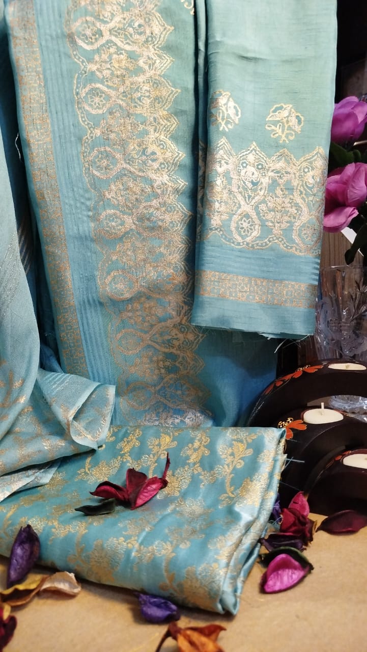 ✔ Unstitched Korean Silk Shirt – Ice blue & turquoise with exquisite block printing