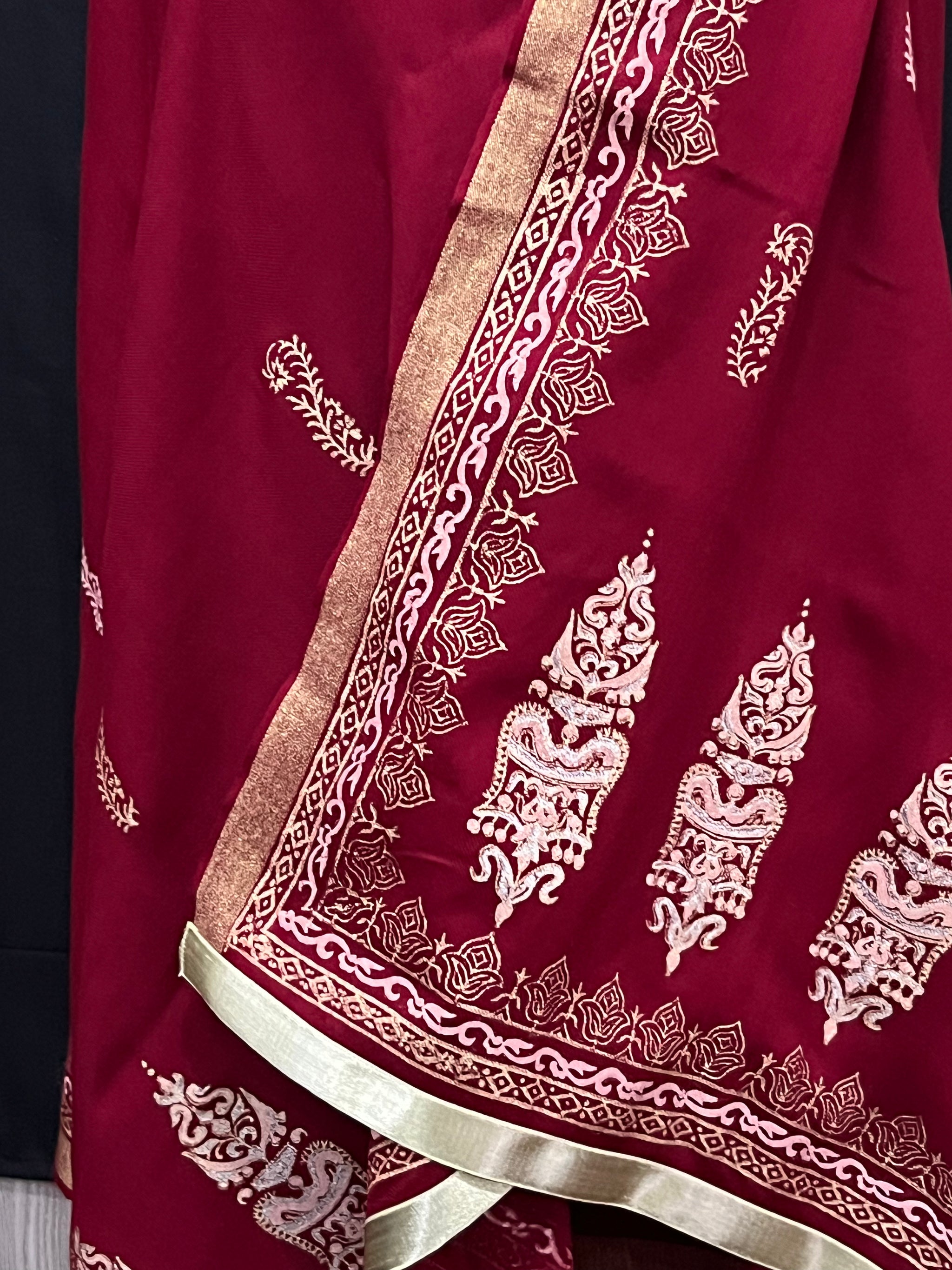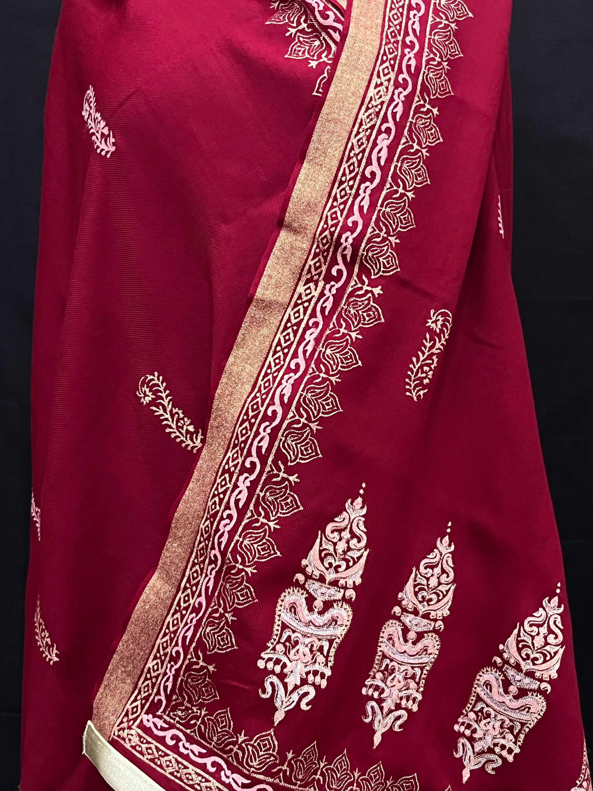 Indulge in luxury with our Bright Red pashmina. This exquisite piece features a stunning red shade adorned with elegant off-white and gold blockprinting. Drape it over your shoulders for a touch of sophistication and elevate any outfit with its richness. Perfect for those seeking a touch of opulence in their wardrobe.