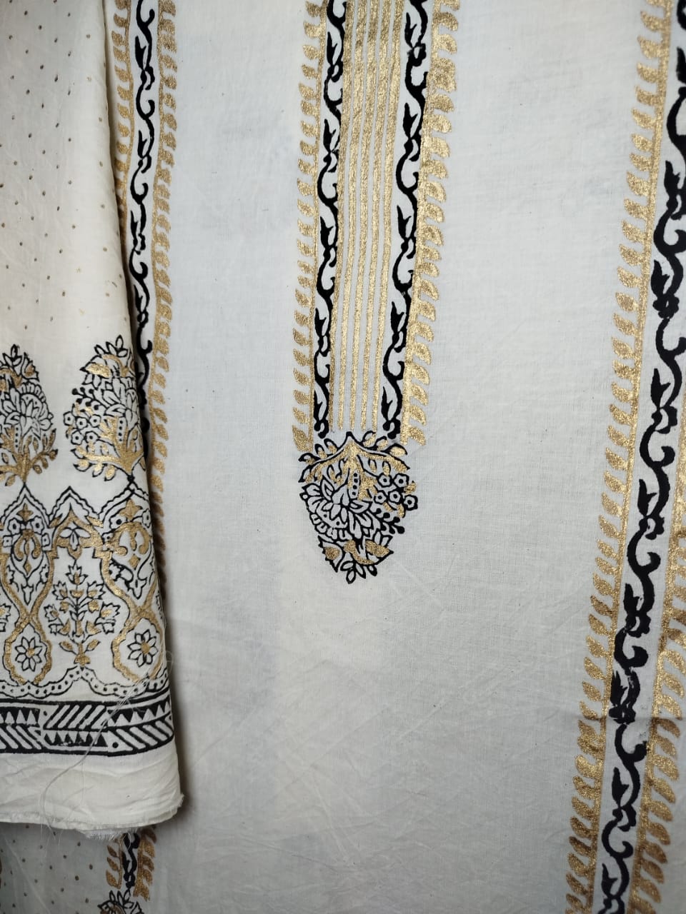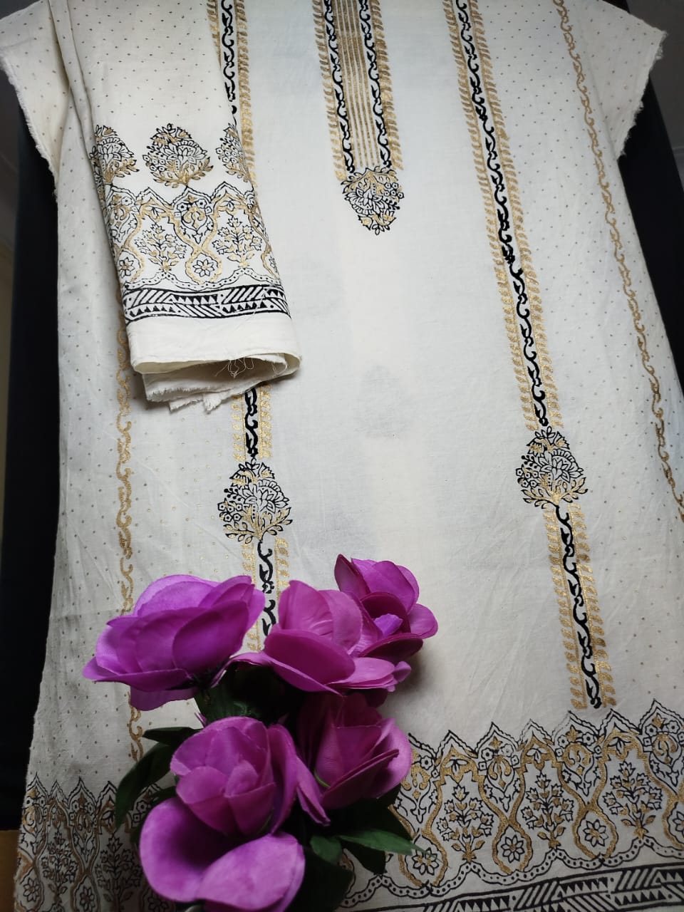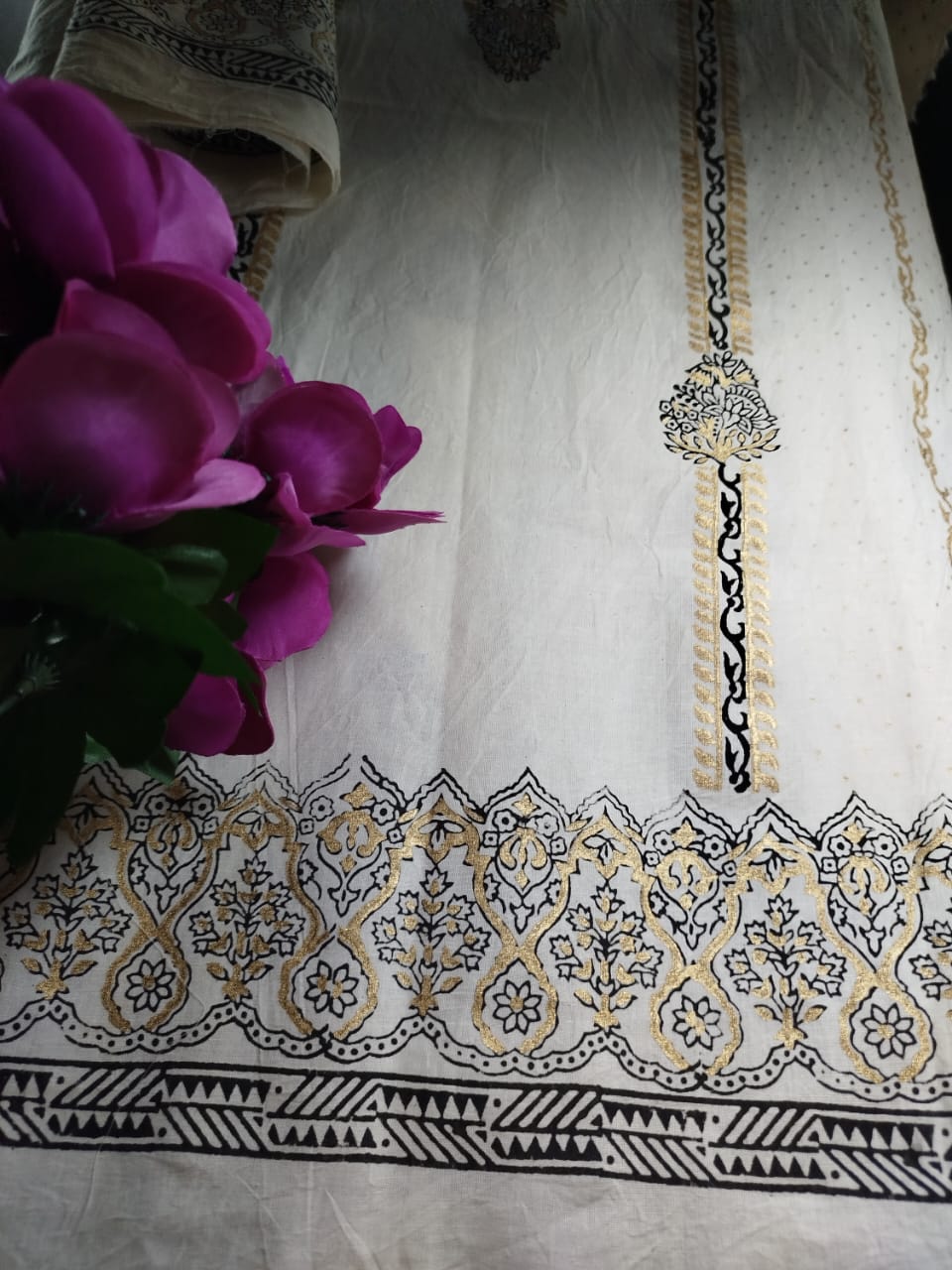 This elegant handcrafted blocked fabric is a perfect blend of subtle sophistication and traditional charm. Featuring delicate floral motifs in golden and black  on a creamy white base, the fabric is adorned with intricate borders and fine detailing. The floral design is complemented by dotted patterns that add texture and grace.