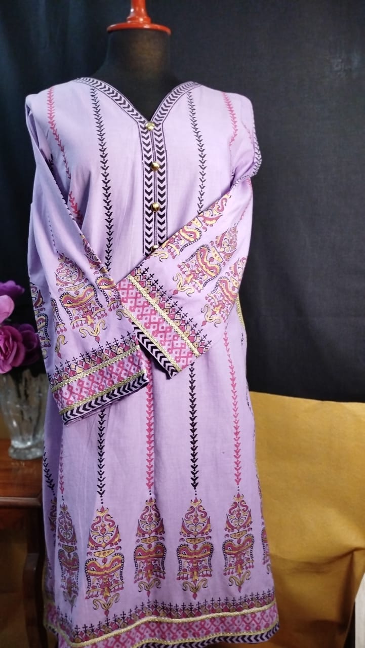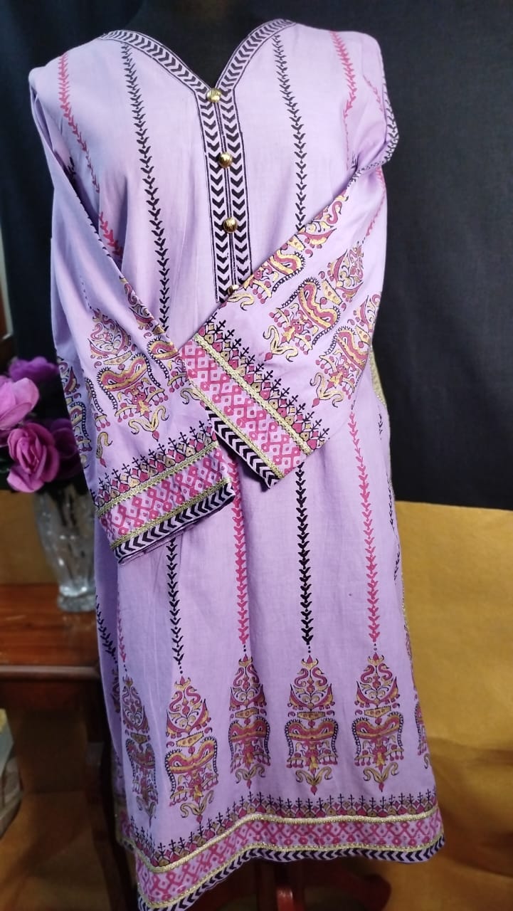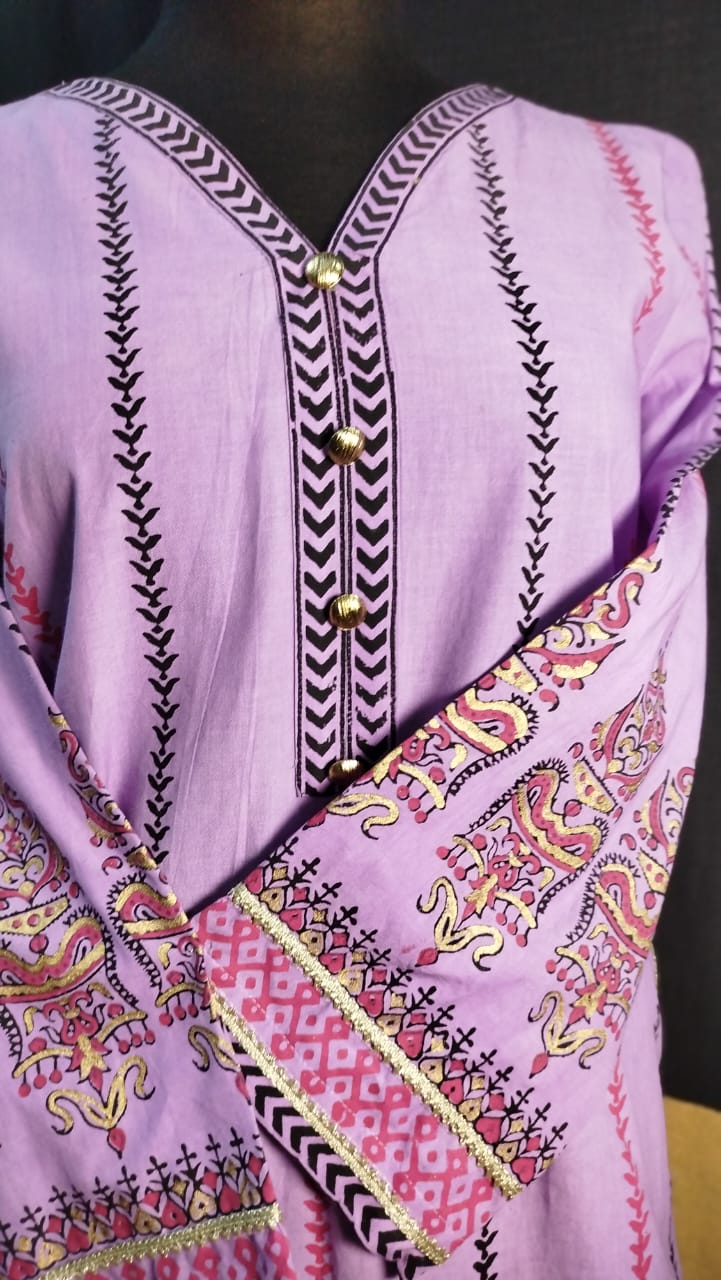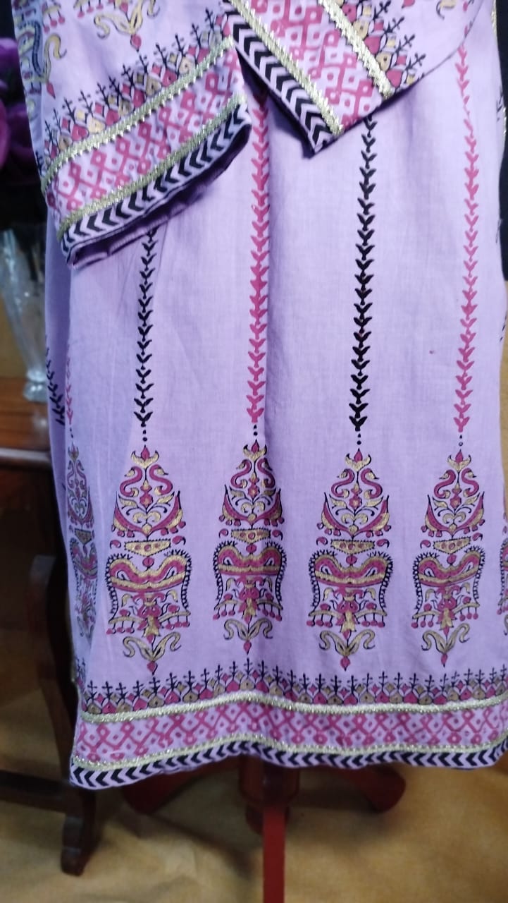 This Cool Lilac lawn shirt features elegant stitching and intricate block printed designs in striking shades of red, black, and gold. Perfect for adding a touch of sophistication and style to your wardrobe. Made of high-quality material for ultimate comfort and durability.